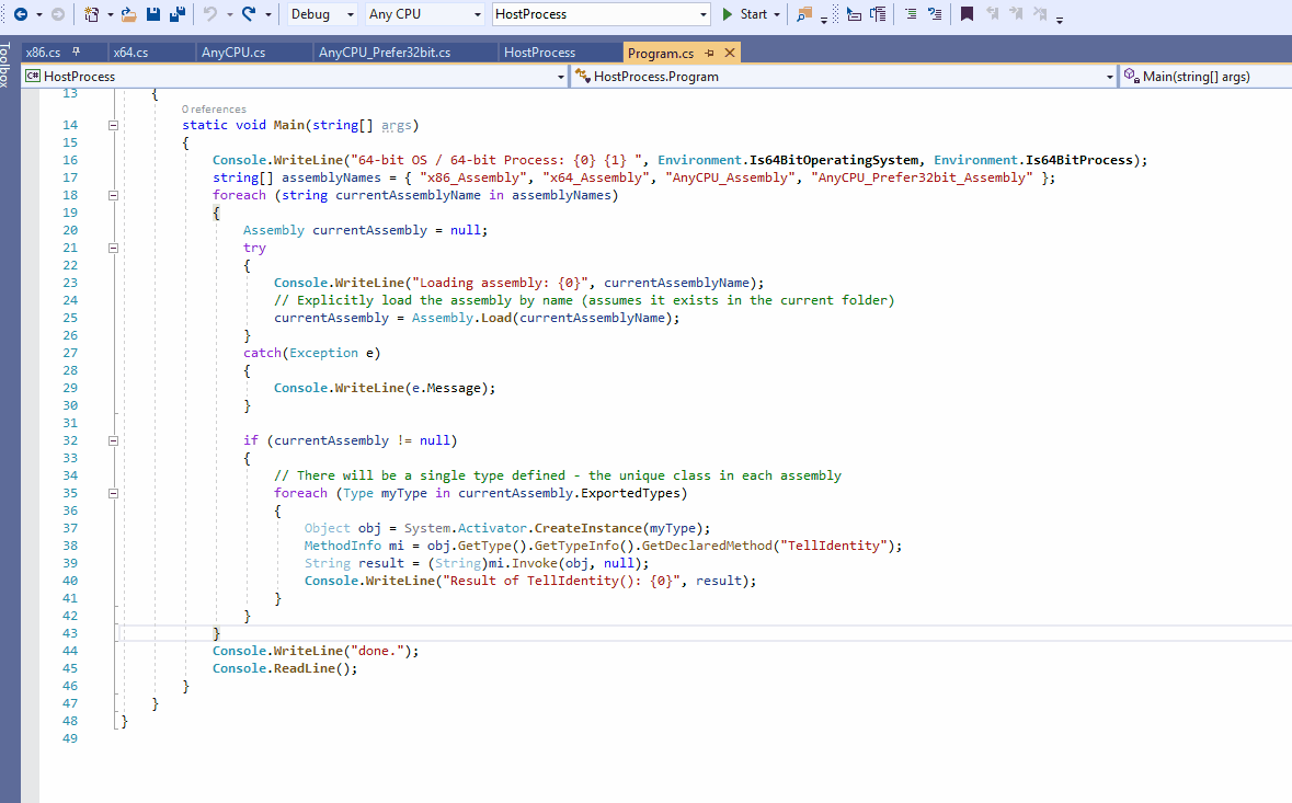Next we’ll need a host process that will load all of the 4 assemblies in turn. This process – an assembly in itself – will first be compiled for the first of the target platforms option, then executed so that it loads all 4 assemblies defined above, then it will be compiled for the next target, then executed again to load all 4 assemblies, and so on. This way we’ll get all 16 possible combinations.