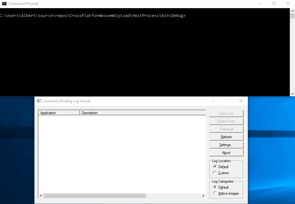 A: You’d want to use Fuslogvw.exe, the assembly binding log viewer. It can be started by launching the Developer Command Prompt for VS. The first thing is to enable logging, and the simplest way is to run as administrator (as a comment to an answer here correctly points out); you can alternatively set the ForceLog regkey specified here if running as a regular user account. Below you can see the events generated from our sample code, modified as per the previous question so that execution pauses right before loading the 4 assemblies: