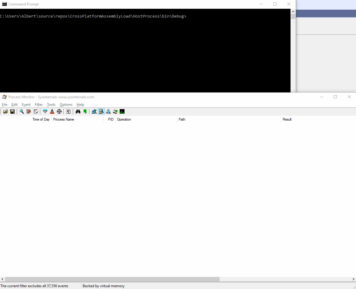 A: I’m glad you asked. Let’s first see what goes on with a x86 host process (I’ve compiled using AnyCPU and Prefer 32-bit checked to get a x86 host process). We’ll use Process Monitor to see which files are being accessed while our test code runs. The filter is set to list file events generated by the host process itself, and whose path is – in turn – mscoree.dll and clr.dll, which are the 2 tell-tale signs the CLR is being loaded. I’ve also went ahead and added a delay right after the app starts, but before the 4 assemblies get loaded. This way we get to see if any CLR pops up after the initial one is loaded: