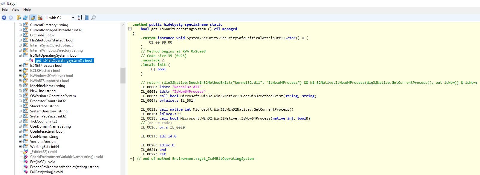 A: System.Environment.Is64BitOperatingSystem is used by the host process to get the info. Let’s look at the code of this property, so see what goes on. This property lives inside the mscorlib.dll assembly, which the C# compiler will always reference (unless you specifically exclude it). But remember there’s 2 versions of CLR, depending on the “bitness”, and as such, there are 2 versions of this DLL as well. Let’s look at the x64 one using ILSpy: