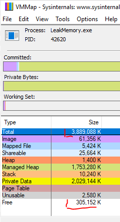 How about we sum the 2 values – the total size and the free space ? The number is exactly 4 GB. Intriguing. This seems to suggest that the total memory our process gets is exactly 4 GB.