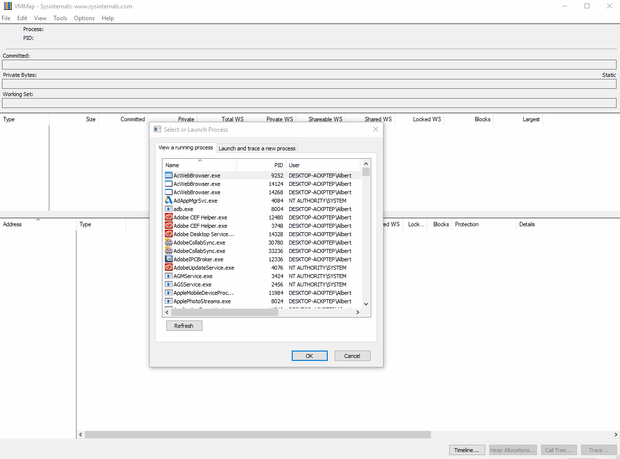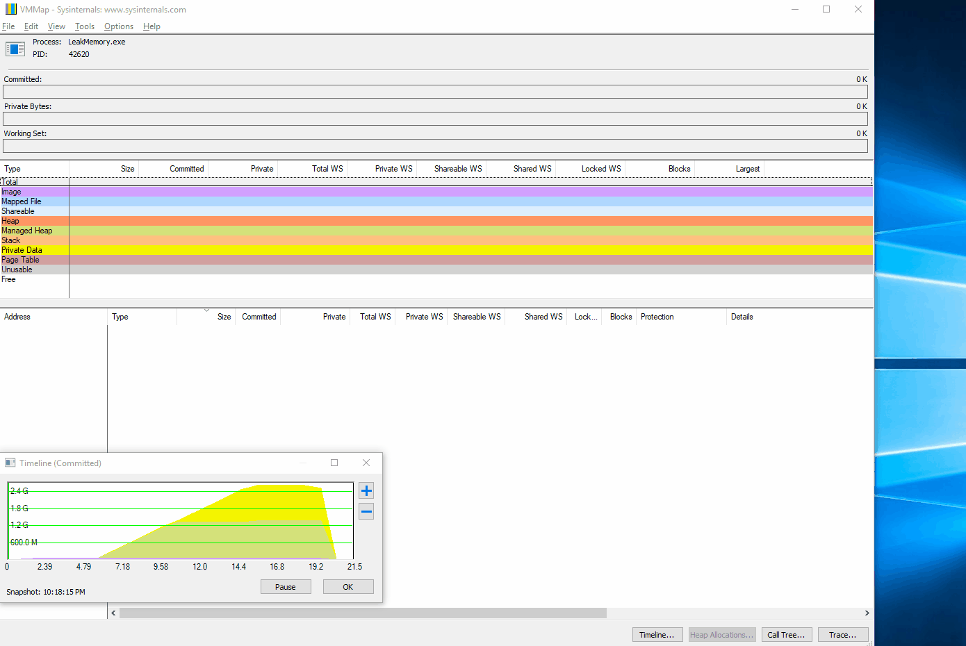 Clearly we need a tool that can shed more light on the problem, and allow us to see the memory usage in better detail. Enter VMMap, which is “a process virtual and physical memory analysis utility. It shows a breakdown of a process’s committed virtual memory types as well as the amount of physical memory (working set) assigned by the operating system to those types“. The “committed” and “virtual memory” parts might sound scary for now, but nonetheless, the tool seems to tell where the memory goes from the operating system’s point of view, which should show significantly more than Visual Studio’s integrated memory profiler. Let’s give it a spin: