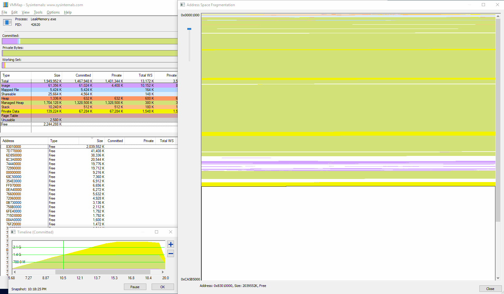 A: There’s a bug in the current version of VMMap, whereby the 32-bit version – needed to analyze the 32-bit executable for the int allocator code – incorrectly classifies virtual addresses pointing to .NET allocated data above 2 GB as private data, instead of managed heap. You’ll also see that the working set for all int arrays classified as such appears to be nothing – when in reality this is not the case. I’m currently (4/21/2019) in contact with Mark Russinovich (the author of VMMap) to see how this can be fixed. The bug however doesn’t exist in the 64-bit version of VMMap, and all the allocations will correctly show up as ‘Managed Heap’.