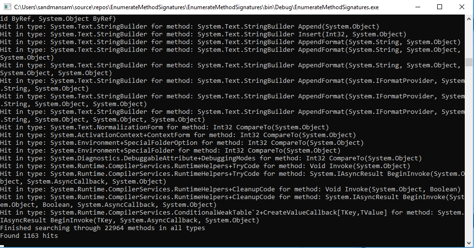 The first thing in our quest for finding specific method signatures is to go get a list of methods. This – in turn – requires obtaining the list of types that actually contain all those methods.