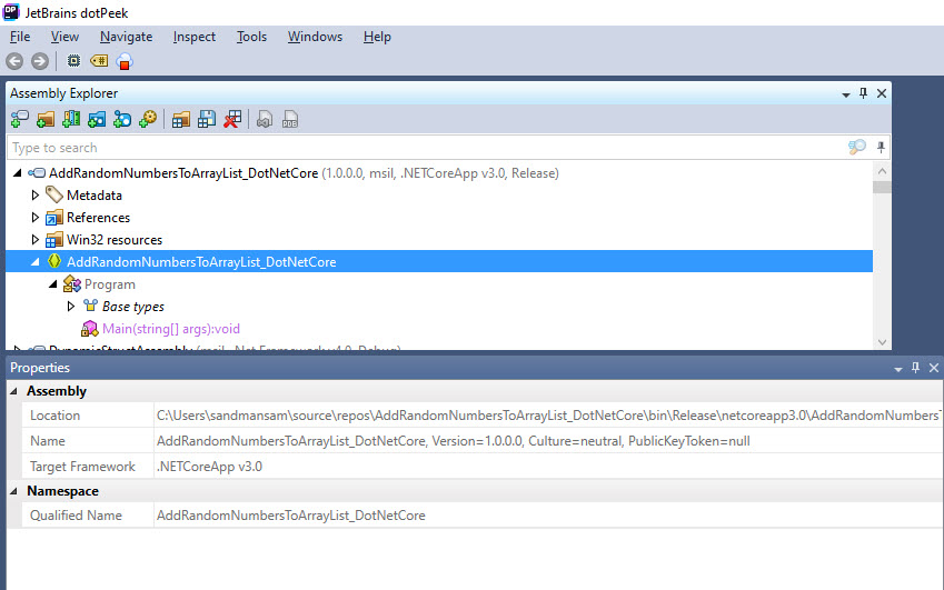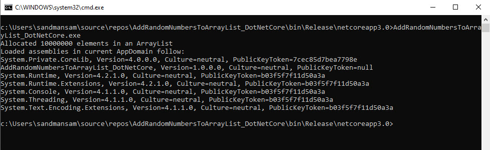 In the output of our console app (figure 4) you can see 7 assemblies loaded: one is the assembly generated for our app (AddRandomNumbersToArrayList_DotNetCore) while the rest of 6 belong to .NET Core’s own assemblies.