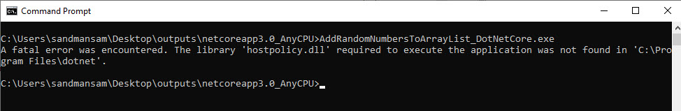 A: If you read the message carefully, you’ll understand that the problem is that the .NET Core runtime cannot be found. You either need to install it (if you have a runtime-dependent app) or ensure that the bundled files are all there (for a self-contained app). You’ll typically get the message if you only brought the .exe and the .dll of your app (assuming you didn’t publish as a single-file exe). As to why is that particular library referenced, if you look back at figure 3, hostfxr.dll is the first component invoked when the processing starts. There’s not much happening without it. Note also that the .dll most likely is present, otherwise you’d ran into The application to execute does not exist: XXX.dll captured back in figure 1.