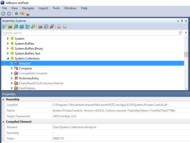 The System.Private.CoreLib assembly (or CoreLib) is special. As stated here: “CoreLib (also known as System.Private.CoreLib) is the lowest level managed library“. If we run a .NET decompiler (eg ILSpy or JetBrains’ dotPeek) against System.Private.CoreLib, we’ll see ArrayList defined within, underneath the System.Collections namespace. Multiple other base types are defined inside as well: