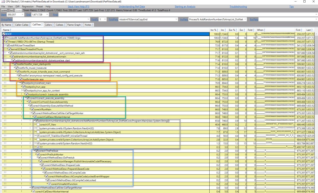 Coming back to our sample code, here’s PerfView’s “CPU Stacks” CallTree view after running against our sample code – the colours used to highlight the functions called by each component are the same as those used in the diagram in figure 3.