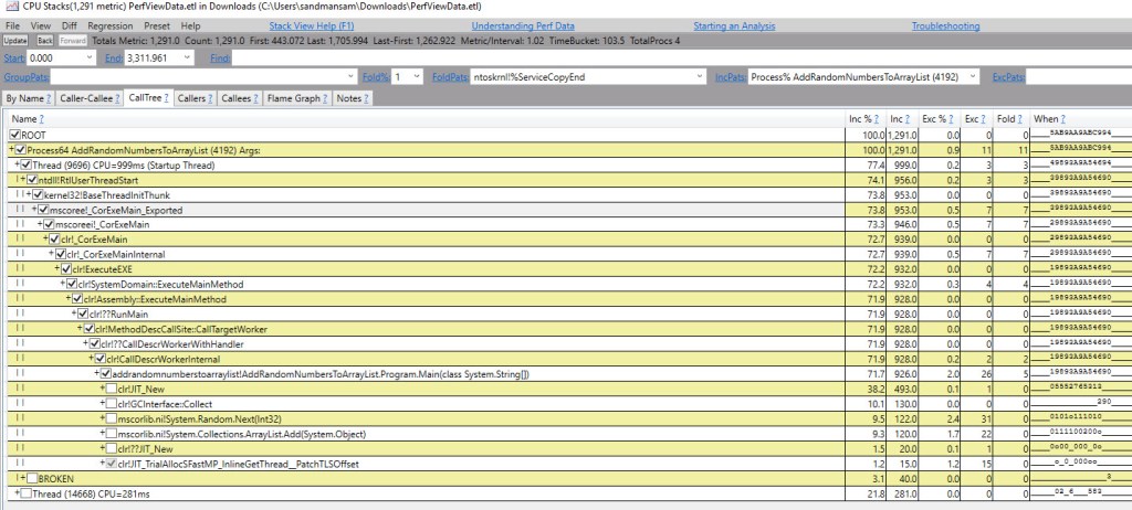 PerfView’s “CPU Stacks” CallTree view will be used. What this view does it simply takes the CPU stacks that have been collected during the trace – which by default is one stack every 1 ms – and aggregates these in an intuitive view. In a way of saying, it “stacks” the stacks. An example: