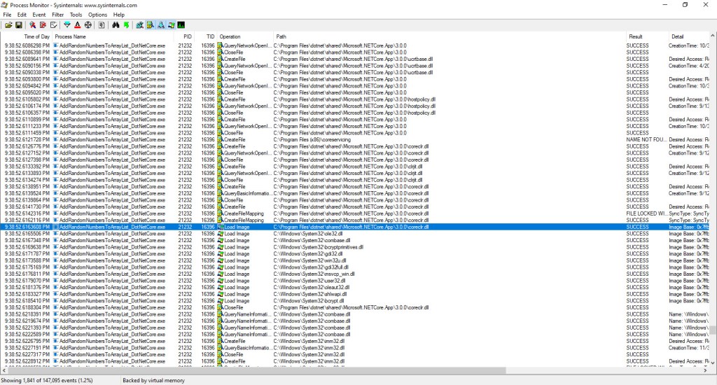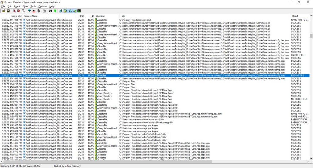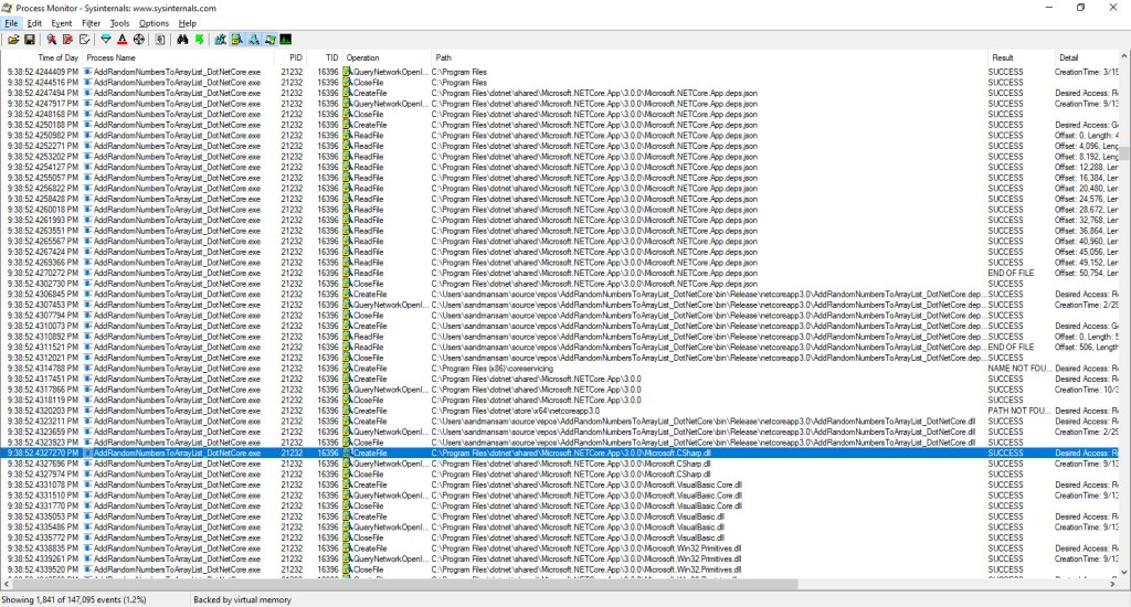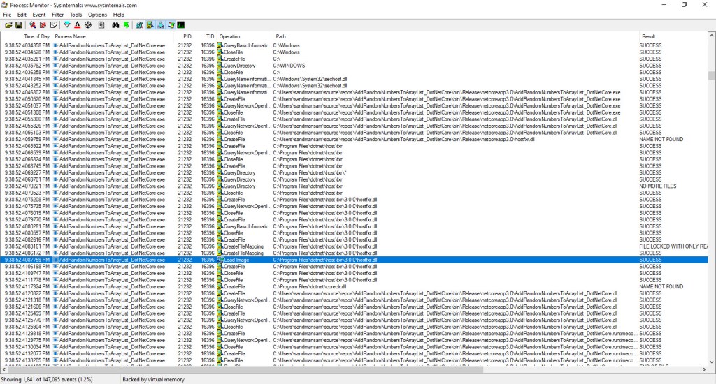 Though PerfView “CPU Stacks” is a very powerful tool, it won’t really show what files are accessed, their path and in which order this occurred. This can provide valuable info, such as which version of .NET Core was loaded, when are the dependencies read in the startup sequence, what are the specific assemblies that end up being loaded and in what order, etc. Luckily ProcMon can do all of this. For each event logged we also get the CPU stack as well, allowing to see what caused the respective operation.