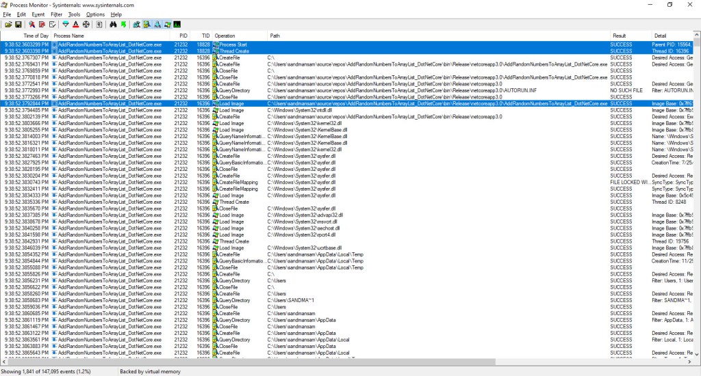 Here’s what ProcMon captures from the moment our app is started until it completes: