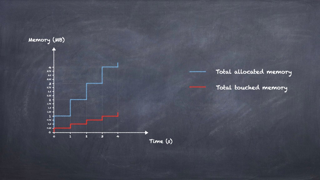 One can easily see that increasing the delay between allocations will result in a “stretched” pattern, with each stair “step” in the diagram being wider. Choosing a shorter delay will in turn “squash” things closer on the X-axis. On the other hand, a touch fill ratio of 1 will ensure that the sum of touched memory will closely track the sum of allocated memory – essentially we’ll touch all the memory we’re allocating. Contrast this with a touch fill ratio of 0, where none of the memory gets touched, which is essentially the scenario in figure 1.
