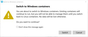 From the tray icon for Docker use the “Switch to Windows containers” menu. You’ll be prompted with the warning below: