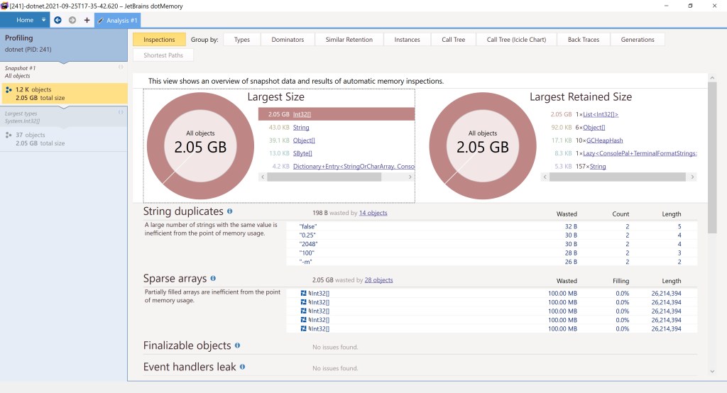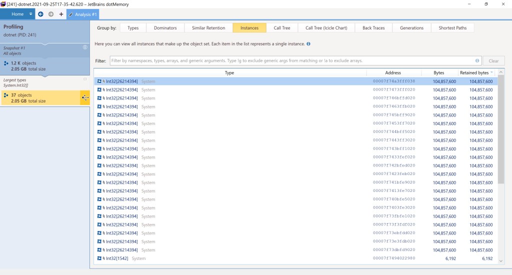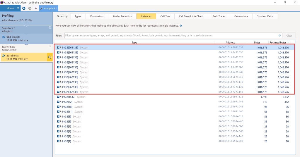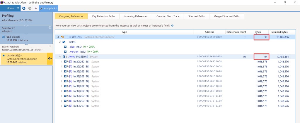 The List’s internal array will take n x pointer size bytes, where n is the number of memory blocks to be allocated, plus pointer size bytes for its size, plus 2x pointer size for its own sync block index and type object pointer. Keep in mind that dotMemory doesn’t include the space taken by the inner int[][] array in the “Bytes” field for the List<int[]>, but only what is uses directly. The internal array’s space is shown separately. Here are both values below for the 10x 1 MB block allocation considered: