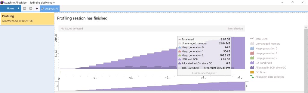 Note the output resembling figure 1, as dotMemory shows only the allocated memory, regardless of how much of it is touched.