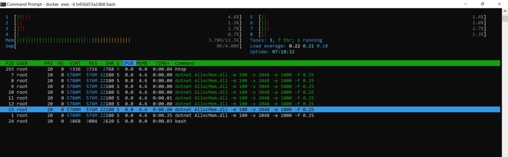 How to quickly check that the tool works as expected inside a container as well? Just use an interactive session to that container (docker exec -it <container_id> bash) to install htop (apt-get update + apt install htop on Ubuntu) and see it works as expected: