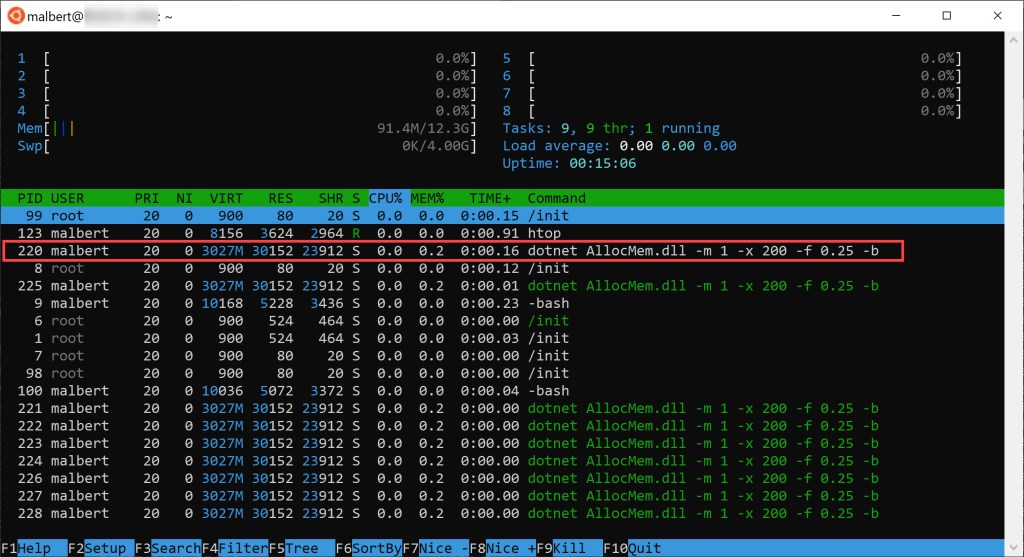 But the value shown (~80 MB) is rather high and a bit far off from our 50 MB target (= 0.25 touch fill ratio* 200 MB overall to allocate). That’s because once our tool’s process starts, but before memory allocation starts, there’s already memory that’s in use (mapped files for the various .NET modules, internal objects the CLR needs, etc). Here’s a previous snapshot of htop for our scenario showing the initial state:
