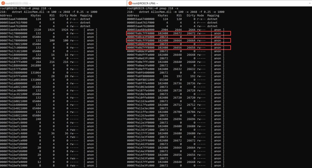 How do we know these are the VMAs that hold our allocations? 3 reasons: first, their RSS (resident set size) is almost 25% of their size. Second, they’re part of the few new VMAs that showed up during our allocation; we know this since the left console shows the initial state of the process address space for the tool right before the allocations started. Third, “anon” in the pmap output refers to anonymous mapping, which in turn simply means the pages inside the respective segment aren’t used to map the contents of a file; the fact that their access is read/write (rw) is further proof that our allocations caused them.