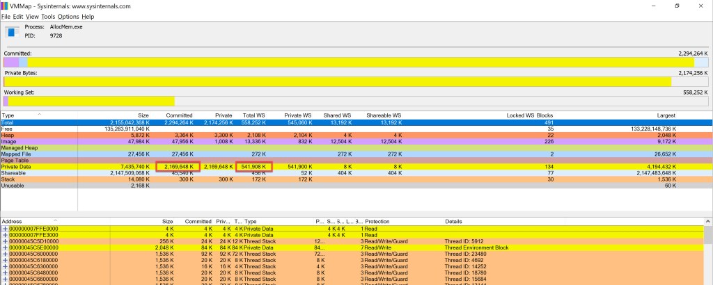 The committed memory will include – amongst others – all the blocks our tool will allocate. The working set will normally show how much of the memory our tool has touched. For both committed memory and working set it’s the “Private Data” section that we’ll want to watch out for.